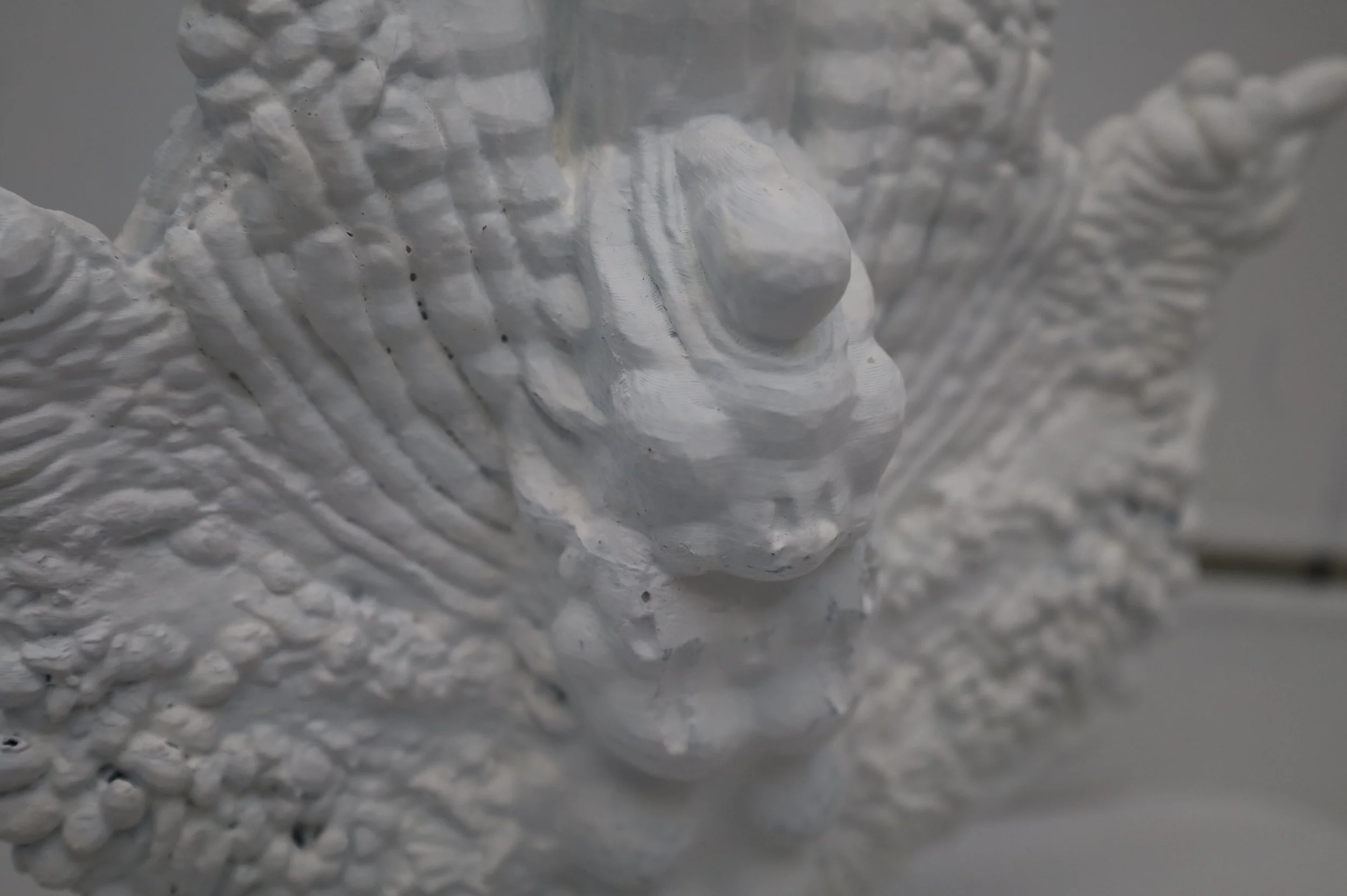 Anachronistic Specimen takes shape through the recorded movements of worms, whose regulated and altered states parallel my own experience of bodily control. Their traces are translated into data and reconstructed as a sculptural form. The work is placed within an enclosed display under a heating bulb, with projected worm movements and ultrasound imagery in the background.